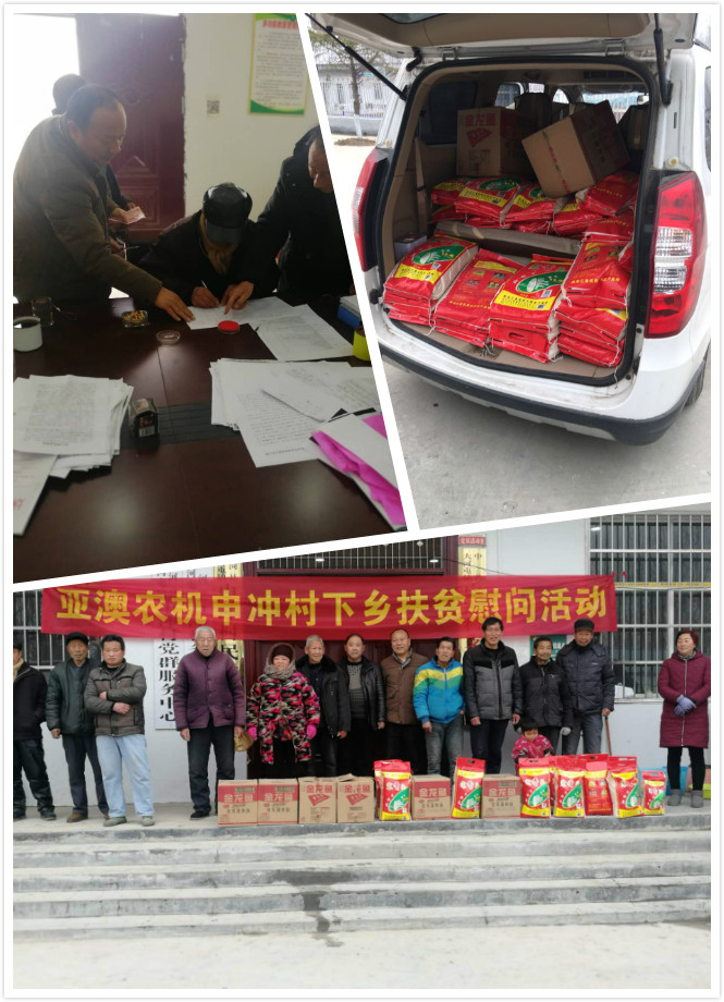 2019年1月19日上午,亞澳公司總經(jīng)理助理郭靖及工會主席白拴禮帶著春節(jié)慰問品米面油等扶貧物資,來到對口扶貧村大河屯鎮(zhèn)申沖村為38戶特殊困難群眾送溫暖。這其中不乏鰥寡孤獨者、因病致病者,無一不是處于巨大的生活困頓之中。郭總及白主席搬下慰問品米、油等物資,送給一戶戶貧困戶。